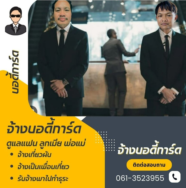 จ้างบอดี้การ์ดเป็นเพื่อนเที่ยว จ้างบอดี้การ์ดดูแลแฟน ลูกเมีย พ่อแม่ และมีงานอื่นๆแบบรับเงินวันต่อวันอีกนะค่ะ ทักคุยงานได้ถนนพาหุรัดนะค่ะ. จ้างเที่ยว, หาเพื่อนเที่ยวจ้างบอดี้การ์ดมากินข้าวเป็นเพื่อนบริการคนขับรถ และบอดี้การ์ดส่วนตัวระดับ VIP